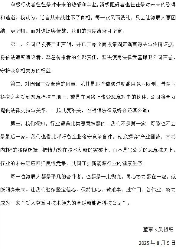信中披露,公司已啟動法律程序,將依法追究造謠者責(zé)任,并承諾為受牽連員工提供全方位支持。吳祖鈺更直言:“謠言從來戰(zhàn)勝不了真相,每一次風(fēng)雨洗禮,只會讓海辰人更團(tuán)結(jié)、更堅韌。”
