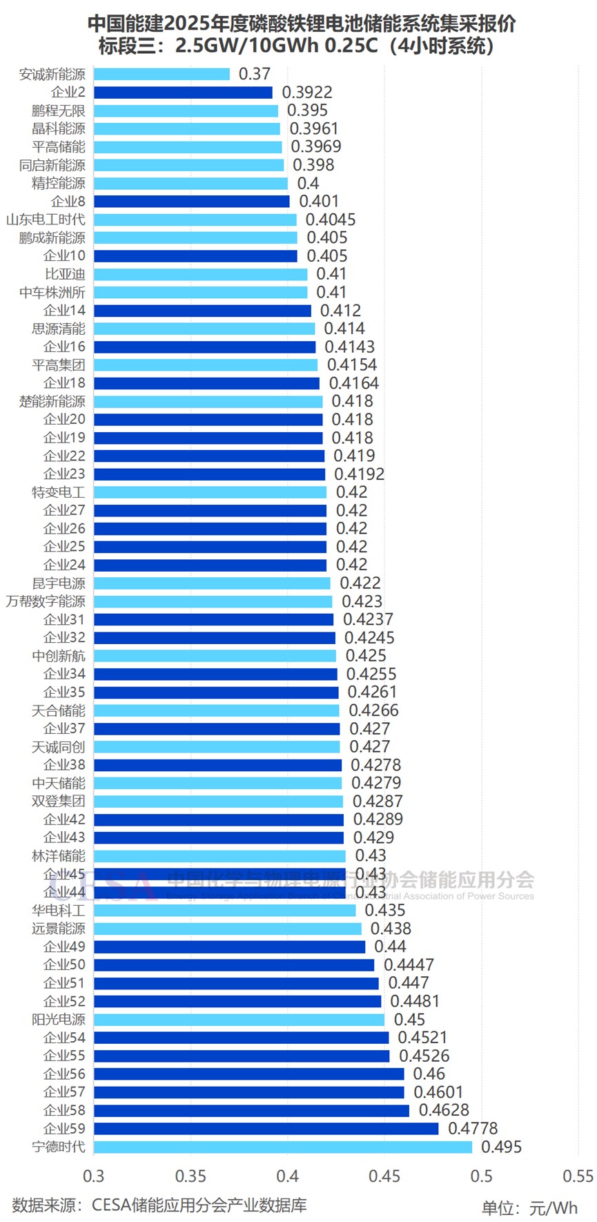 標(biāo)段三(4h儲能系統(tǒng)):采招規(guī)模為2.5GW/10GWh,60家企業(yè)參與競標(biāo),共26家企業(yè)入圍,入圍報(bào)價(jià)在0.37-0.495元/Wh區(qū)間內(nèi),平均報(bào)價(jià)0.4185元/Wh,最低報(bào)價(jià)0.37元/Wh來自于安誠新能源,創(chuàng)4h鋰電儲能系統(tǒng)報(bào)價(jià)新低。