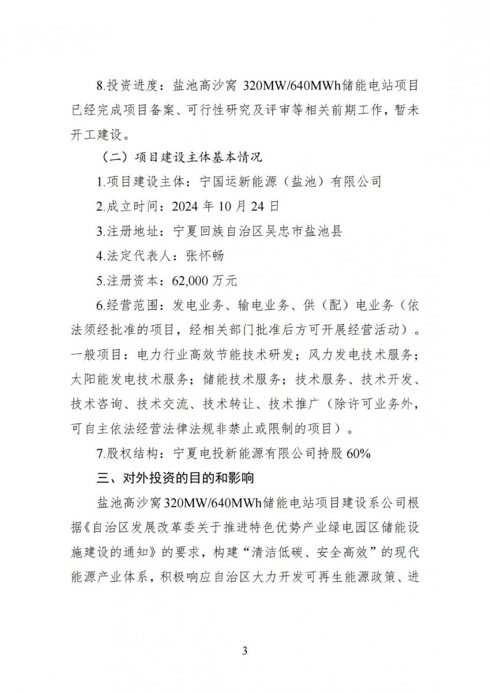 中國儲能網(wǎng)訊:8月12日,寶塔實(shí)業(yè)發(fā)布公告稱,為進(jìn)一步提高公司新能源發(fā)電裝機(jī)規(guī)模,提升公司整體盈利能力,公司控股子公司寧國運(yùn)新能源(鹽池)有限公司擬投資建設(shè)寧國運(yùn)新能源(鹽池)有限公司高沙窩320MW/640MWh儲能電站項(xiàng)目。鹽池高沙窩320MW/640MWh儲能電站項(xiàng)目動態(tài)總投資(以下簡稱“總投資”)約為人民幣49,233.45萬元,資金來源為地方政府專項(xiàng)債券資金、自有資金及金融機(jī)構(gòu)融資等。