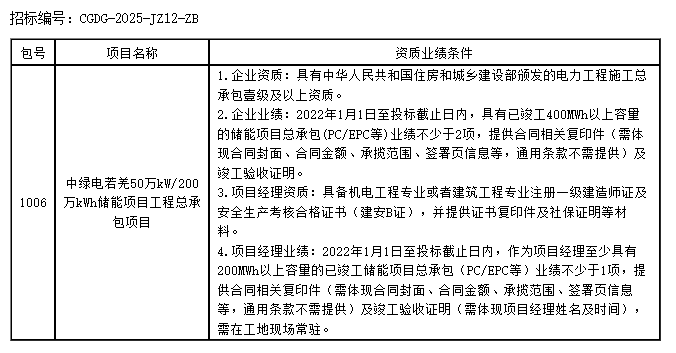 其中儲(chǔ)能系統(tǒng)采購(gòu)要求交貨時(shí)間為2025年10月30日前全部到貨,以買(mǎi)方下達(dá)的采購(gòu)訂單約定為準(zhǔn)。要求投標(biāo)人應(yīng)具有國(guó)內(nèi)累計(jì)到貨業(yè)績(jī)不低于2GWh,其中至少包含2個(gè)單體項(xiàng)目容量500MWh及以上或1個(gè)單體項(xiàng)目容量1GWh及以上的磷酸鐵鋰電化學(xué)儲(chǔ)能系統(tǒng)集成設(shè)備的到貨業(yè)績(jī)。