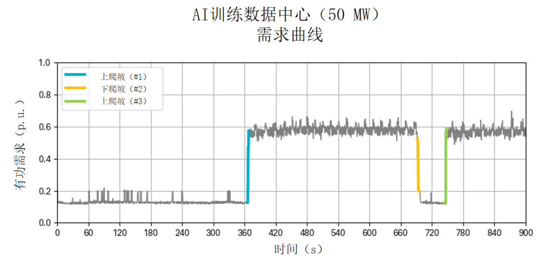 2025年7月,北美電力可靠性公司(NERC)發(fā)布了其大型負(fù)荷工作組首份白皮書[1],該白皮書提到,加拿大電力設(shè)備供應(yīng)商Edge Tune Power公司通過高速記錄儀采集了AI模型訓(xùn)練與推理應(yīng)用的電力需求(圖1)。數(shù)據(jù)顯示,在快速爬坡階段,負(fù)荷以每秒1.9標(biāo)幺值(p.u.)的速率持續(xù)變化約250毫秒。訓(xùn)練過程中會出現(xiàn)高頻抖動型尖峰(圖1中360-660秒?yún)^(qū)間)。此類劇變既出現(xiàn)在“空閑與峰值利用率”狀態(tài)切換時,也發(fā)生于“工作負(fù)荷正常運行期間”,主要歸因于訓(xùn)練步驟中計算密集型與網(wǎng)絡(luò)密集型階段的交替出現(xiàn)[2]。