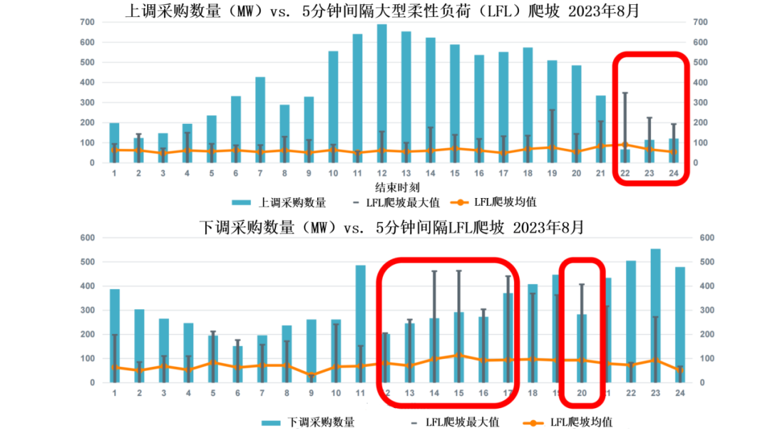 2023年8月,得克薩斯州電力可靠性委員會(ERCOT)的系統(tǒng)運行數(shù)據(jù)為行業(yè)提供了警示案例[3]。大型柔性負(fù)荷(Large Flexible Load,LFL)在深夜時段的上調(diào)爬坡最大需求超出了當(dāng)時系統(tǒng)運營商采購的上調(diào)資源數(shù)量。其中,22時觀測到的實際爬坡最大值達(dá)到當(dāng)前上調(diào)采購數(shù)量的4倍之多。在正午至傍晚時段(12時-17時),下調(diào)爬坡需求也多次超出采購的下調(diào)數(shù)量。