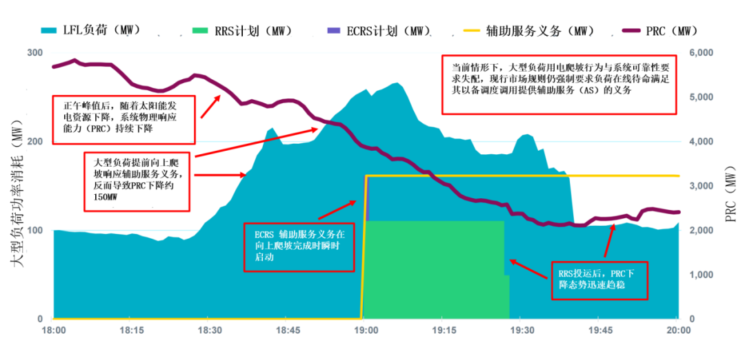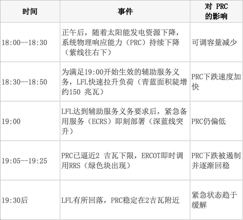 2023年9月6日傍晚,得州ERCOT電網(wǎng)進(jìn)入緊急能源警報(EEA)狀態(tài)(圖4)。其核心原因之一是:大型柔性負(fù)荷為履行其輔助服務(wù)義務(wù),在系統(tǒng)物理響應(yīng)能力(PRC)不足時段反而快速拉升“出力”。負(fù)荷拉升與太陽能出力下降相疊加,導(dǎo)致系統(tǒng)可調(diào)容量PRC驟降并接近警戒水平。最終,ERCOT被迫緊急調(diào)用響應(yīng)式備用服務(wù)(RRS)才挽回PRC下降趨勢。