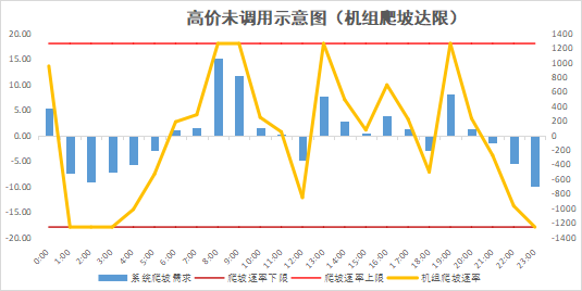 典型案例:7月24日日前市場,晚高峰時段某電廠#1套機節(jié)點電價高于申報價格,但機組出清負荷低于對應(yīng)申報價格的負荷段出力。其原因一般為兩種情況,第一種是受自身調(diào)節(jié)特性影響,在系統(tǒng)負荷需求變化較快的時間段,機組響應(yīng)系統(tǒng)爬坡需求,當(dāng)機組達到爬坡速率限值時,機組在相應(yīng)的時段內(nèi)無可用爬坡能力,無法滿足系統(tǒng)需求,不參與市場定價,只能作為市場價格接受者,因此出現(xiàn)高價未調(diào)用情況。