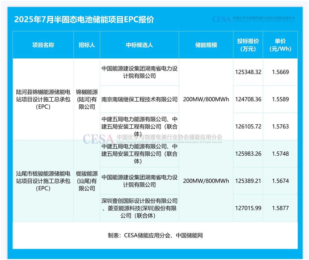 2025年7月,陸河縣錦樾能源半固態(tài)鋰離子電池儲(chǔ)能電站項(xiàng)目和汕尾市櫳駿能源半固態(tài)鋰離子電池儲(chǔ)能電站項(xiàng)目開標(biāo),其EPC入圍報(bào)價(jià)在1.5589-1.5877元/Wh,平均報(bào)價(jià)1.572元/Wh,中標(biāo)加權(quán)均價(jià)1.5708元/Wh,比液態(tài)鋰電池儲(chǔ)能項(xiàng)目EPC均價(jià)高60.52%。