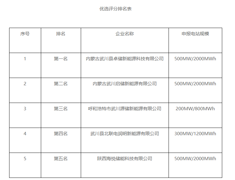 中國儲能網(wǎng)訊:8月20日,內(nèi)蒙古武川縣人民政府公布武川縣儲能電站項目優(yōu)選結(jié)果公示,公布了優(yōu)選評分排名表的前五名,最終內(nèi)蒙古武川縣卓儲新能源科技有限公司500MW/2000MWh項目入選。