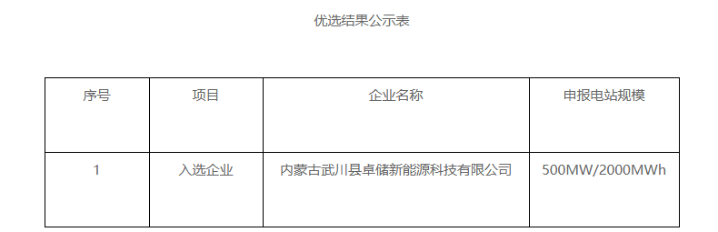 武川縣儲能電站項目優(yōu)選結(jié)果公示