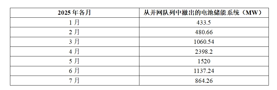 下表展示了2025年各月從ERCOT并網(wǎng)隊列中撤出電池儲能系統(tǒng),可以看出4月出現(xiàn)了一個高峰,隨后每月逐漸下降,直至7月。