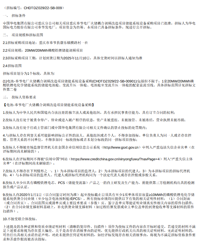 中國儲(chǔ)能網(wǎng)訊:8月22日,中國華電集團(tuán)有限公司重慶分公司相關(guān)項(xiàng)目重慶奉節(jié)電廠火儲(chǔ)耦合調(diào)頻改造項(xiàng)目儲(chǔ)能系統(tǒng)設(shè)備采購-招標(biāo)公告發(fā)布。采購范圍包括但不限于1套20MW/20MWh磷酸鐵鋰電化學(xué)儲(chǔ)能系統(tǒng)的儲(chǔ)能電池艙、變流升壓一體艙、電池艙至變流升壓一體艙的配套直流引線。