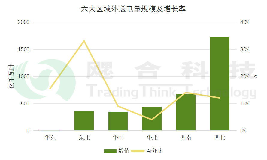 按區(qū)域送電情況看,西北跨區(qū)外送交易電量1736億千瓦時(shí),東北跨區(qū)外送交易電量362億千瓦時(shí),華北跨區(qū)外送交易電量440億千瓦時(shí)。