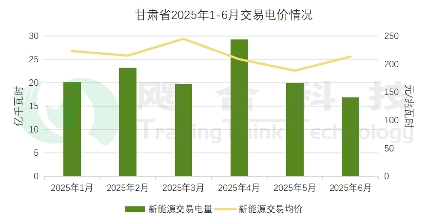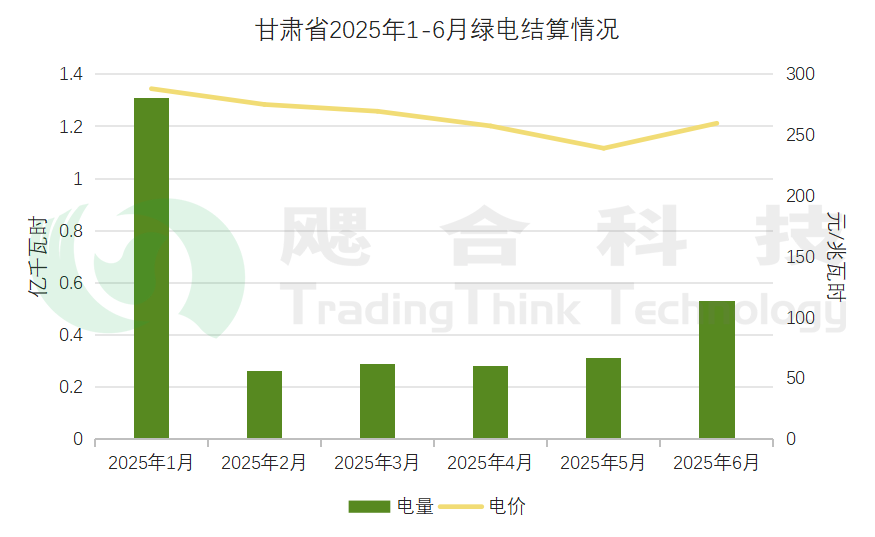 2025年1-6月甘肅省結(jié)算綠電電量2.98億千瓦時(shí),結(jié)算均價(jià)264.96元/兆瓦時(shí)。