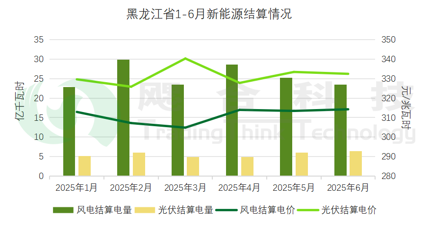 黑龍江省2025年1-6月新能源總計(jì)結(jié)算電量為186億千瓦時(shí),風(fēng)電1-6月結(jié)算均價(jià)為311元/兆瓦時(shí),光伏1-6月結(jié)算均價(jià)為331元/兆瓦時(shí)。