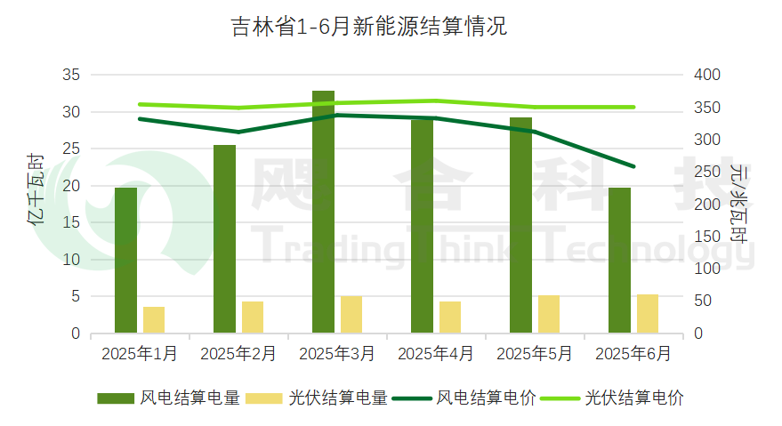吉林新能源機(jī)組電能量結(jié)算均價(jià)情況如下:風(fēng)電機(jī)組總計(jì)結(jié)算電量為155.78億千瓦時(shí),結(jié)算電價(jià)為316.94元/兆瓦時(shí);光伏機(jī)組結(jié)算電量為27.61億千瓦時(shí),結(jié)算電價(jià)為353.53元/兆瓦時(shí)。