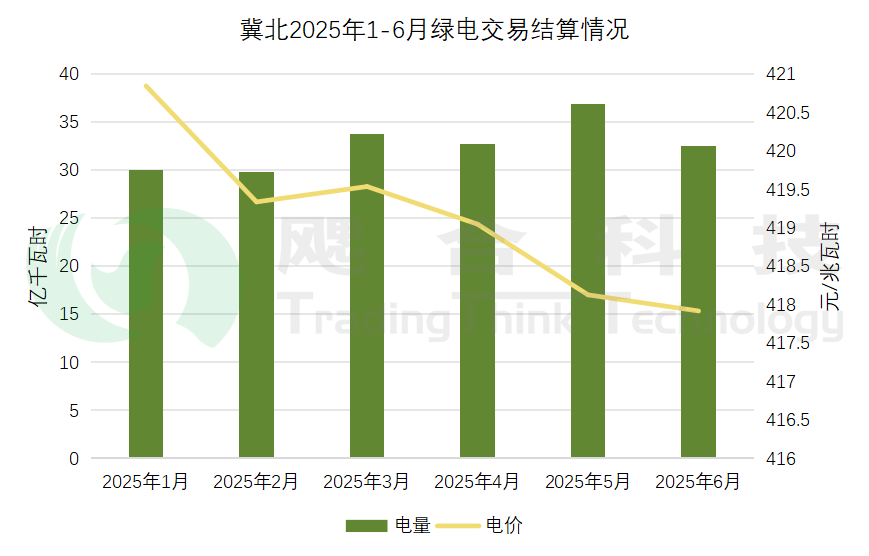 冀北地區(qū)2025年1-6月綠電結(jié)算電量196.01億千瓦時(shí),結(jié)算均價(jià)419.09元/兆瓦時(shí)。