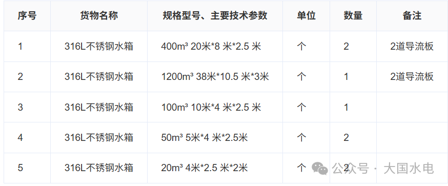 采購范圍:河南輝縣九峰山抽水蓄能電站施工局所需 316L不銹鋼水箱及相關(guān)服務(wù)