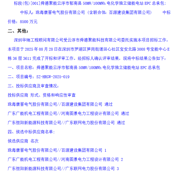 中國儲能網(wǎng)訊:8月28日,舜德聚能云浮市郁南縣50MW/100MWh電化學獨立儲能電站EPC總承包中標信息公示。珠海康晉電氣股份有限公司、百源建設(shè)集團有限公司聯(lián)合體以8500萬元中標該項目,折合單價0.85元/Wh。廣東廣能機電工程有限公司和河南圖景電力工程設(shè)計有限公司聯(lián)合體、東恒陽新能源科技有限公司和廣東聯(lián)網(wǎng)電力股份有限公司聯(lián)合體分列第二第三位。