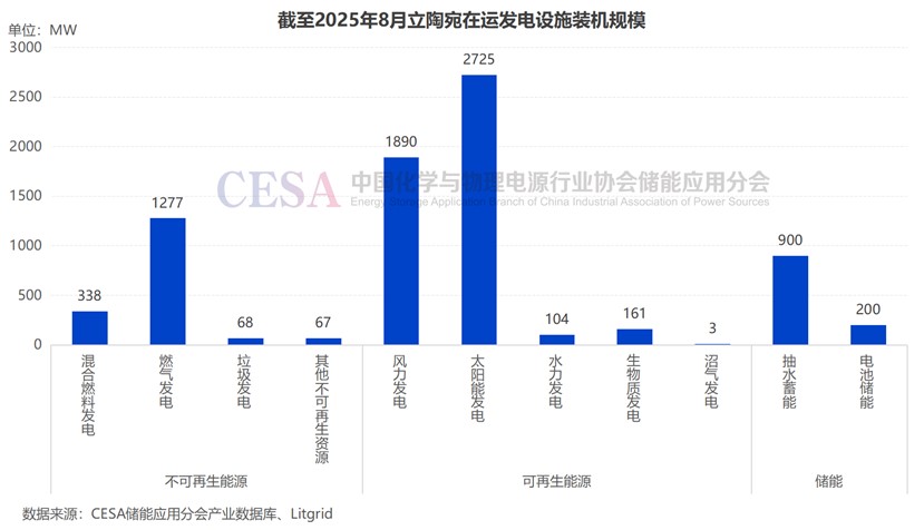 2025年繼續(xù)保持增長態(tài)勢,據(jù)CESA儲能應(yīng)用分會產(chǎn)業(yè)數(shù)據(jù)庫不完全統(tǒng)計,截至2025年8月,立陶宛電力總裝機(jī)規(guī)模達(dá)到7.733GW,光伏和風(fēng)電裝機(jī)規(guī)模進(jìn)一步提升。