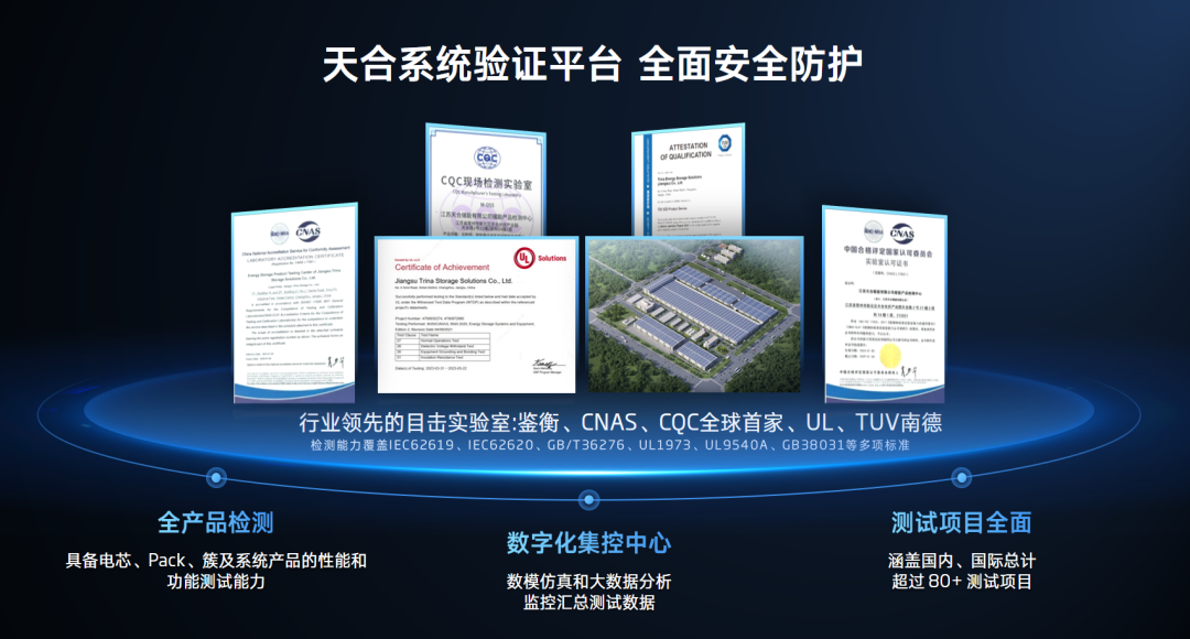 目前,天合儲能已獲得包括鑒衡、TüV南德、UL、CQC等多個國際主流認證機構的目擊實驗室資質。面對行業(yè)快速發(fā)展,天合儲能精準捕捉市場革新趨勢和潛在需求,以卓越的全棧自研技術能力為客戶創(chuàng)造更高價值。公司依托嚴苛的國際標準對儲能產品進行全生命周期管理,嚴格滿足全球所有主要市場的安全法規(guī)要求,持續(xù)贏得全球客戶認可。