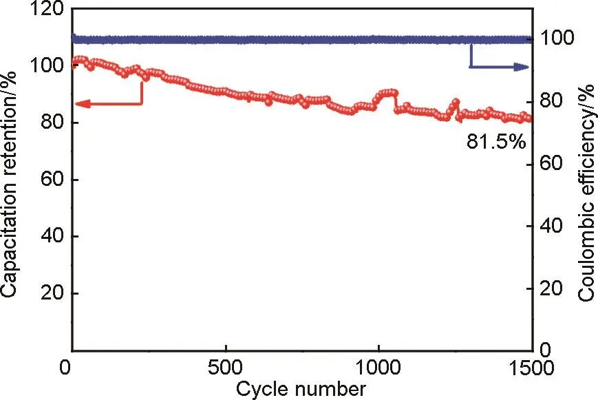 恒功率充放電更接近電池在實際應(yīng)用中的工作情況。為了進一步測試電池在高功率下的循環(huán)性能,對HC//10%N-LCO軟包電池進行充放電功率為30 W的循環(huán)性能測試,如圖6所示。經(jīng)過1500次循環(huán)之后,其容量保持率高達(dá)81.5%,且?guī)靵鲂示S持在接近100%,具有優(yōu)異的恒功率充放電循環(huán)性能。這可歸結(jié)于10%N-LCO材料中的納米顆粒的高比表面積和彈性,能夠通過表面形變和吸收充放電過程中的局部應(yīng)力,減少顆粒破碎。微米顆粒作為結(jié)構(gòu)骨架,能夠提供機械支撐,防止納米顆粒在長周期循環(huán)中發(fā)生團聚或結(jié)構(gòu)坍塌,從而提升電池在高功率充放電條件下的循環(huán)性能。
