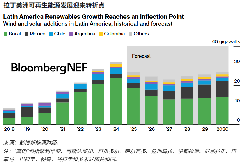 拉丁美洲清潔電力新增裝機可能已在2024年達峰。電力供應過剩、高棄電率及輸電瓶頸預計將終結(jié)該地區(qū)自2018年以來風電和光伏新增裝機加速增長的態(tài)勢。盡管能源領域改革與裝機容量競價顯示今年存在結(jié)構(gòu)性變化,但預計復蘇要到2028年才顯現(xiàn)。