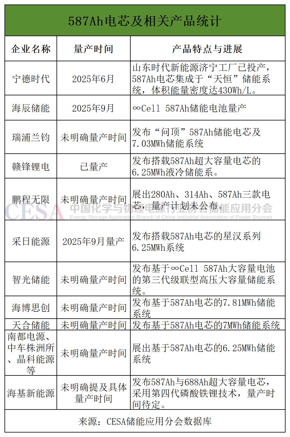 下半年以來(lái),587Ah 電芯的主流化趨勢(shì)明顯加快,呈現(xiàn)出 "頭部引領(lǐng)、產(chǎn)業(yè)鏈跟進(jìn)"的趨勢(shì),10余家企業(yè)發(fā)布587Ah電芯或搭載該電芯的系統(tǒng)產(chǎn)品。