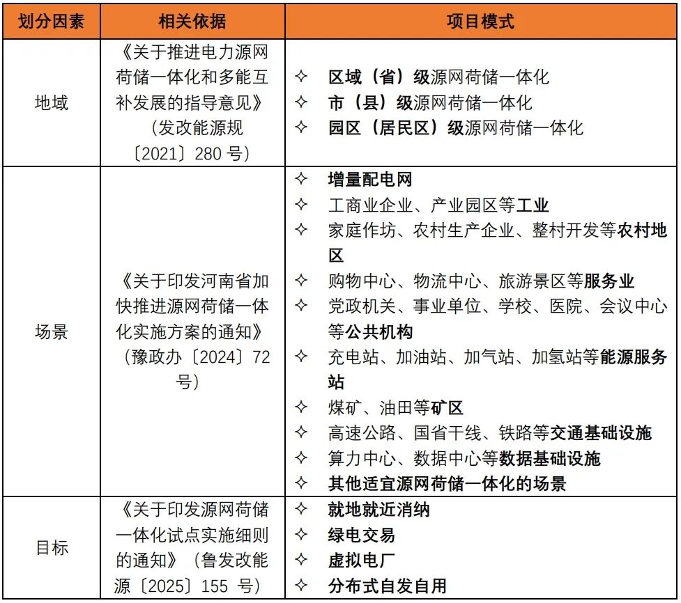 依據(jù)國家和地方層面的相關(guān)規(guī)定,按照地域、場景、目標(biāo)等劃分因素,源網(wǎng)荷儲(chǔ)一體化項(xiàng)目有以下主要模式:
