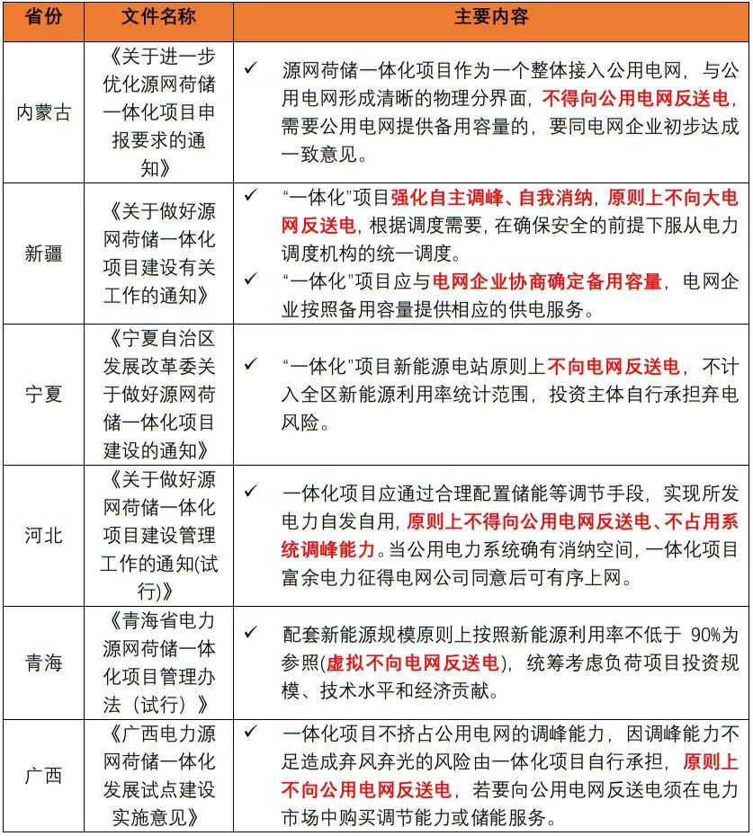 地方層面,針對源網(wǎng)荷儲(chǔ)一體化項(xiàng)目的消納模式,目前大多規(guī)定:原則上不向大電網(wǎng)反送電,列示如下: