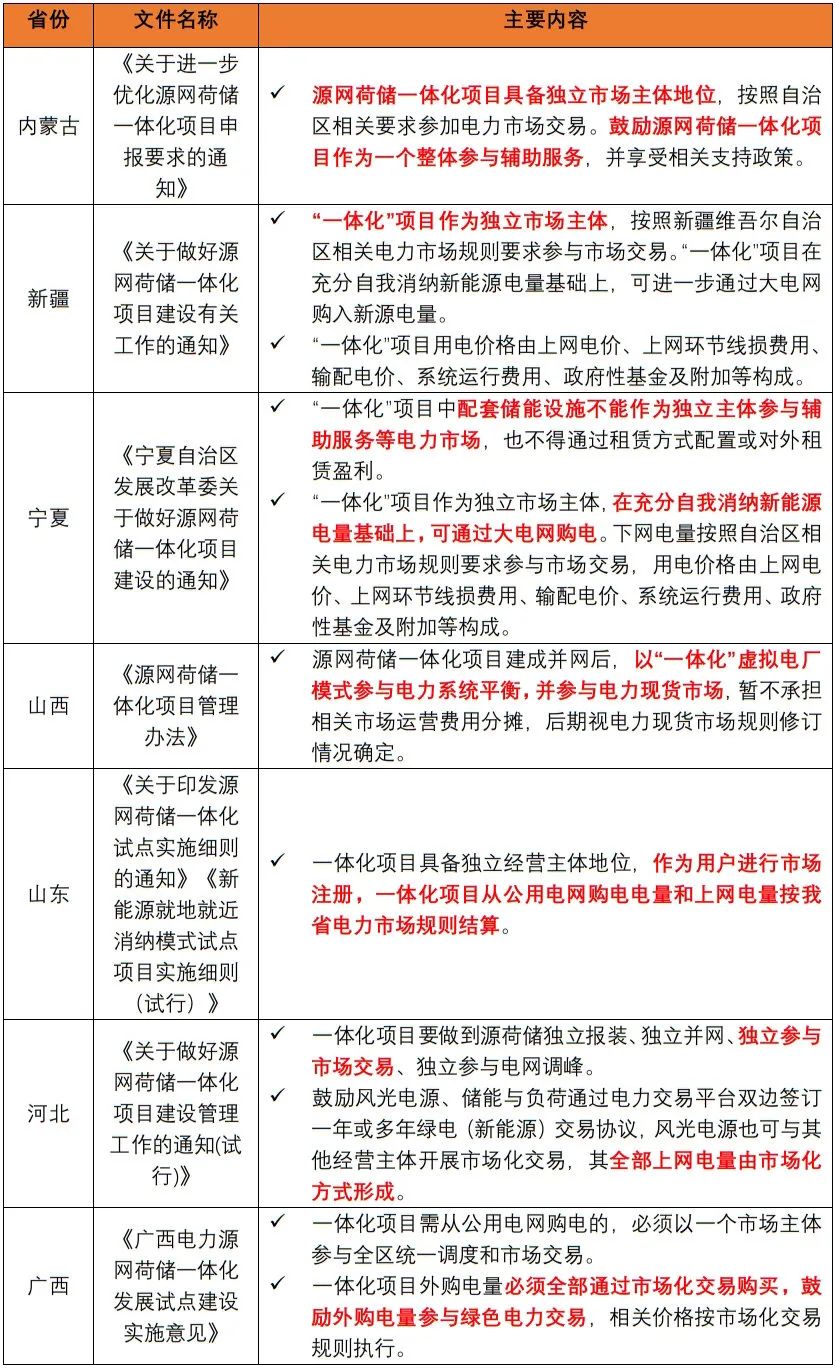 地方層面,目前大多規(guī)定:一體化項(xiàng)目作為獨(dú)立市場主體,按照相關(guān)要求參加電力市場交易,列示如下: