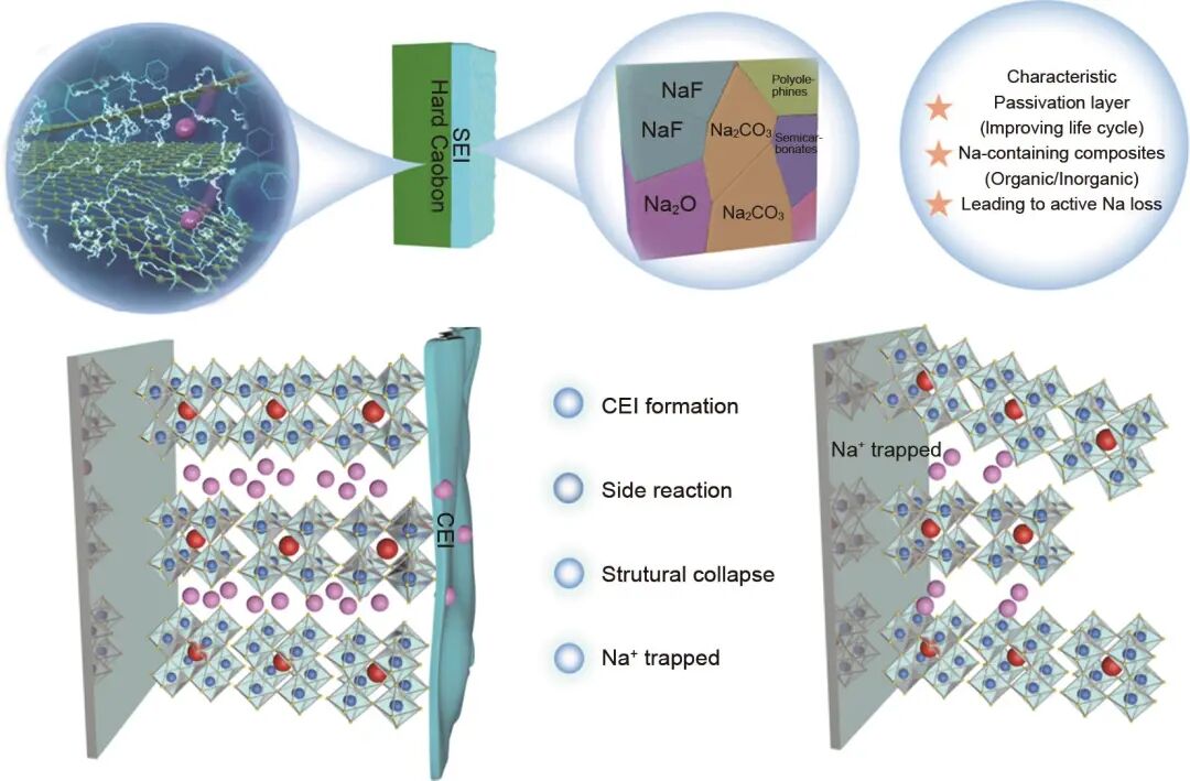 在鈉離子電池的實(shí)際運(yùn)行過(guò)程中,充足豐富的活性鈉離子是保障電池穩(wěn)定可逆循環(huán)的關(guān)鍵。然而,活性鈉離子在首次充放電及循環(huán)過(guò)程中會(huì)被不可逆地消耗,導(dǎo)致電池ICE降低,進(jìn)而引起電池可逆容量顯著下降和循環(huán)壽命縮短?;谇捌谘芯?,初始ICE偏低主要?dú)w因于以下三個(gè)方面(圖1):①首次充放電循環(huán)過(guò)程中不可逆地形成固體電解質(zhì)界面(SEI);②材料表面缺陷對(duì)鈉離子的不可逆捕獲;③正極結(jié)構(gòu)的坍塌。這些因素共同導(dǎo)致首次循環(huán)后電池出現(xiàn)嚴(yán)重的鈉缺失現(xiàn)象,因此,開(kāi)發(fā)有效的鈉補(bǔ)償技術(shù)即“預(yù)鈉化”策略顯得尤為重要。