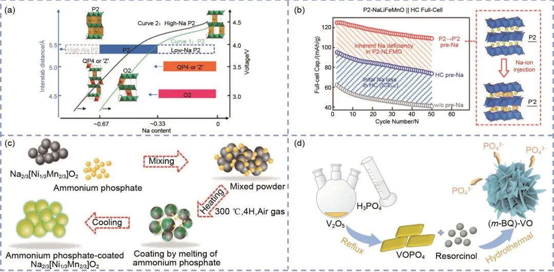 圖3 正極富鈉化技術(shù):(a) Na含量對(duì)P2型材料結(jié)構(gòu)的影響;(b) 電化學(xué)方法向P2型材料注入Na+示意圖;(c) NaPO3包覆P2型材料示意圖;(d) m-BQ插入氧化釩示意圖