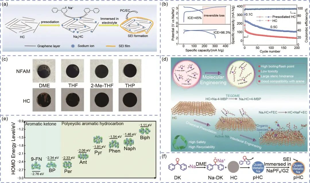 圖6 液態(tài)還原型材料:(a) Na-Biph/DME對(duì)HC預(yù)鈉化示意圖;(b) 預(yù)鈉化前后HC性能;(c) 不同試劑處理NFAM和HC極片后的圖片;(d) Na-Biph/TEGDME對(duì)HC預(yù)鈉化示意圖;(e) 各種芳香化合物的HOMO能級(jí)與其氧化還原電位對(duì)比圖;(f) Na-DK對(duì)HC的預(yù)鈉化過(guò)程示意圖