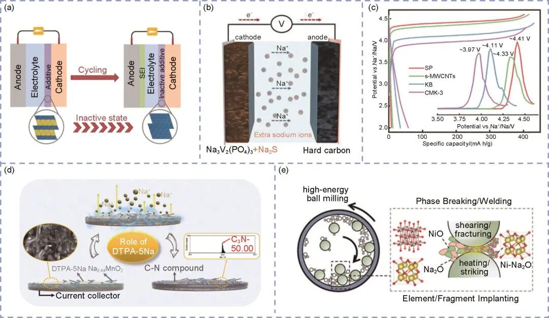 富鈉化的正極材料將額外的鈉引入缺鈉材料轉(zhuǎn)化為富鈉材料,不會(huì)引入其他雜質(zhì),但對(duì)正極材料的選擇有限制,且補(bǔ)鈉的容量有限。未來(lái)研究可通過(guò)探索新的材料體系,設(shè)計(jì)具有特殊結(jié)構(gòu)和性能的材料,如金屬有機(jī)框架(MOF)衍生的過(guò)鈉化正極材料、新型的鈉鹽復(fù)合物以及通過(guò)元素?fù)诫s、表面修飾、形貌控制等手段來(lái)優(yōu)化其性能,從而豐富材料的選擇,以滿足不同應(yīng)用場(chǎng)景對(duì)正極材料性能的要求。通過(guò)材料改性實(shí)現(xiàn)正極富鈉化雖能部分補(bǔ)償鈉損失,但其補(bǔ)鈉容量有限,需結(jié)合更高效的預(yù)鈉化技術(shù)進(jìn)一步提升性能。