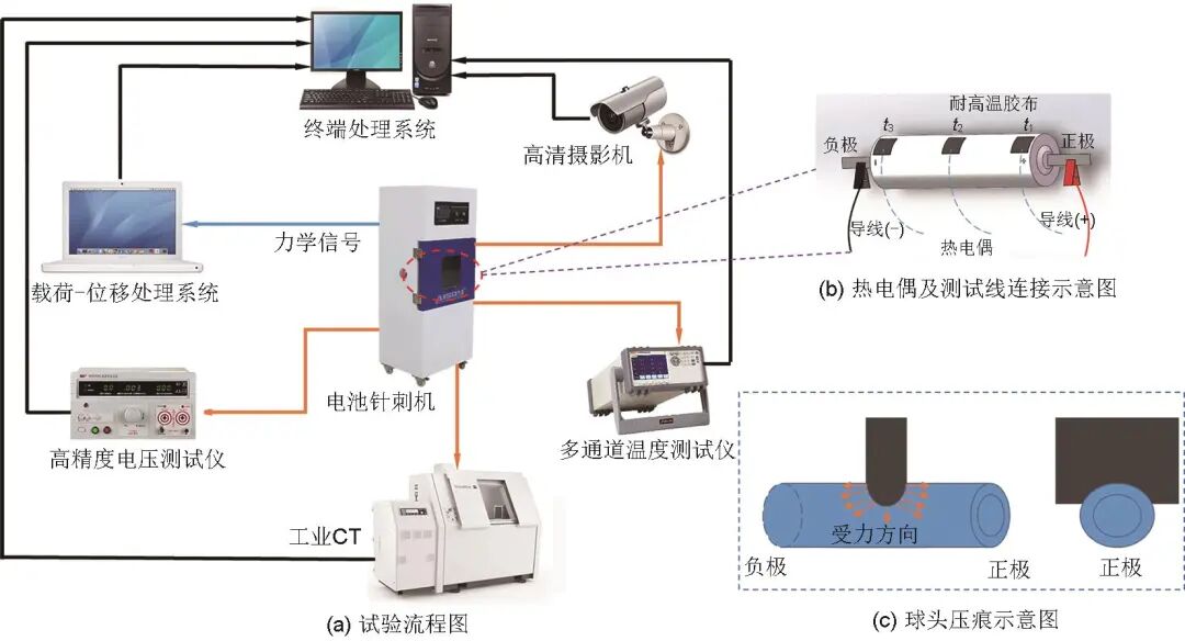 選擇深圳三思縱橫科技股份有限公司生產的suns縱橫風暴系列的電子萬能試驗機作為球頭壓痕試驗機器,選用直徑為1 mm的抗高溫球頭對電池進行擠壓,利用載荷-位移處理系統(tǒng)控制球頭進程并實時輸出載荷數值,搭配多通道溫度測試儀、高精度電壓測試儀、高清攝像頭等實驗儀器記錄相關現象與數據,利用CT技術對壓痕過程進行全程動態(tài)跟蹤掃描,分析電池的內部變形與結構損傷,借助SEM技術剖析正負電極的微觀形貌變化,探究壓痕內短路發(fā)生機理。