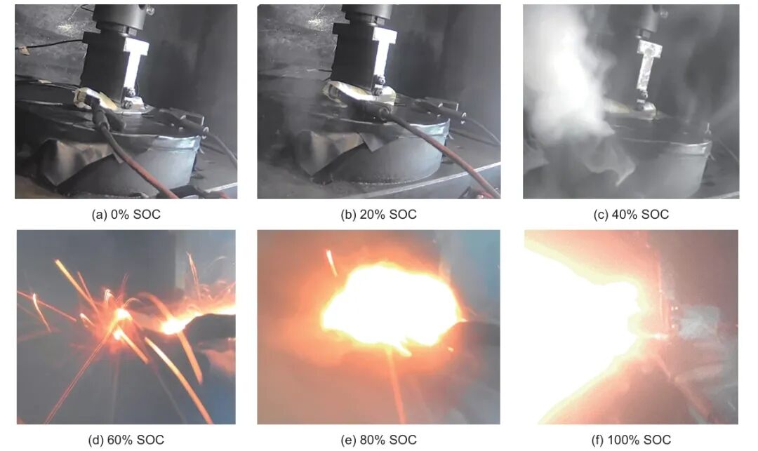 在碰撞事故中,電池會受到不同方向和程度的傷害。電池包的框架受到膨脹和擠壓,可能會對電池造成球壓的現象,從而觸發(fā)內短路機制。為探究不同SOC下電池的安全特征,以1 mm/min的速度對0%、20%、40%、60%、80%和100% SOC的鋰離子電池進行壓痕試驗,且達到9 mm壓痕停止工作。試驗結果如圖2所示,當SOC為0%、20%時,電池僅出現電解液外流,見圖2(a)、(b),SOC為40%時,出現淡煙,伴有刺激性氣體產出,電解液外流現象更嚴重,見圖2(c),以上測試樣品均未發(fā)生熱失控。SOC為60%時,正極側、負極側出現大量濃煙,安全閥被打開,正極側噴射火花,隨之負極側也噴射火花,最終電池多區(qū)域同時發(fā)生火花噴射現象,見圖2(d),電池發(fā)生熱失控。SOC為80%和100%時,火花噴射現象后,電池持續(xù)燃燒約7 s,熱失控現象進一步加劇,見圖2(e)、(f)。