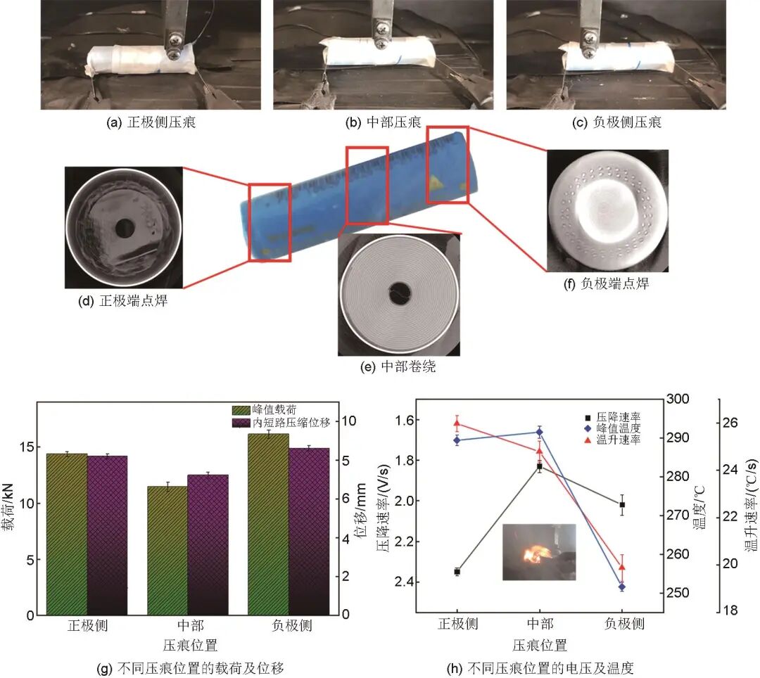 電池正極側、中部、負極側結構有所不同,因此球頭壓痕過程中,壓痕位置不同,實驗效果也會有所不同。選擇60% SOC 18650電容型鋰離子電池,補充對電池正極側與負極側的球頭壓痕實驗,如圖6(a)~(c)所示。正負極兩端與外殼所構成的結構完整性更強,見圖6(d)、(f),承載能力也就越強。而電池外殼中部與電芯層之間存在間隙,見圖6(e),受力較薄弱。圖6(g)展示了不同壓痕位置造成的峰值載荷及失效位移。正極側、中部、負極側位置峰值載荷分別為14.36 kN、11.44 kN、16.14 kN,中部壓痕載荷值小于兩側位置,負極側峰值載荷最大。內短路時的壓痕位移也呈現同樣的變化規(guī)律,如圖6(h)所示,正極側壓降速率更大,更容易發(fā)生內短路,這是因為正極結構易發(fā)生損壞,且靠近安全閥;中部位置峰值溫度最高,這是因為內短路發(fā)生在電芯中部,溫度蔓延效應的導致兩側溫度升高,可燃燒活性物質更多,燃燒更加充分。正極側位置溫升速度更大,這是因為正極離火花噴射點位置更近。綜上可知,正極側位置的球頭壓痕更易發(fā)生內短路現象,對電池的整體破壞更強。