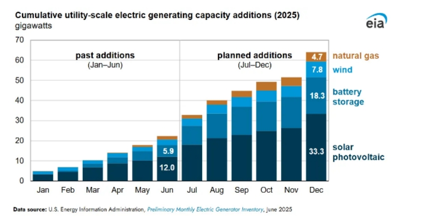 美國(guó)能源信息署(EIA)于2025年8月20日表示:“如果太陽(yáng)能發(fā)電場(chǎng)和電池儲(chǔ)能系統(tǒng)的開發(fā)在2025年按預(yù)期推進(jìn),這兩種能源設(shè)施的新增容量都將超過(guò)以往任何一年。這種增長(zhǎng)在很大程度上歸因于德克薩斯州發(fā)生的變化?!?