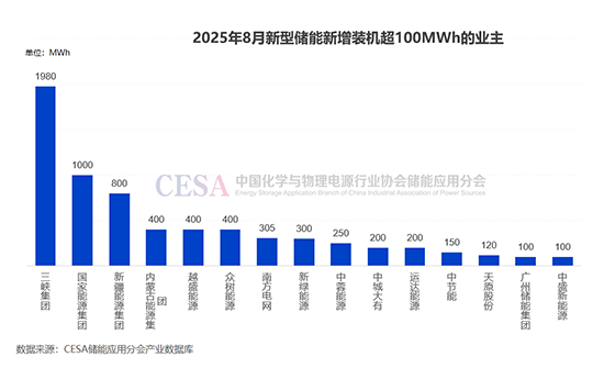 據(jù)CESA儲(chǔ)能應(yīng)用分會(huì)產(chǎn)業(yè)數(shù)據(jù)庫(kù)不完全統(tǒng)計(jì),8月三峽集團(tuán)和國(guó)家能源集團(tuán)新增裝機(jī)容量均為GWh級(jí)別。