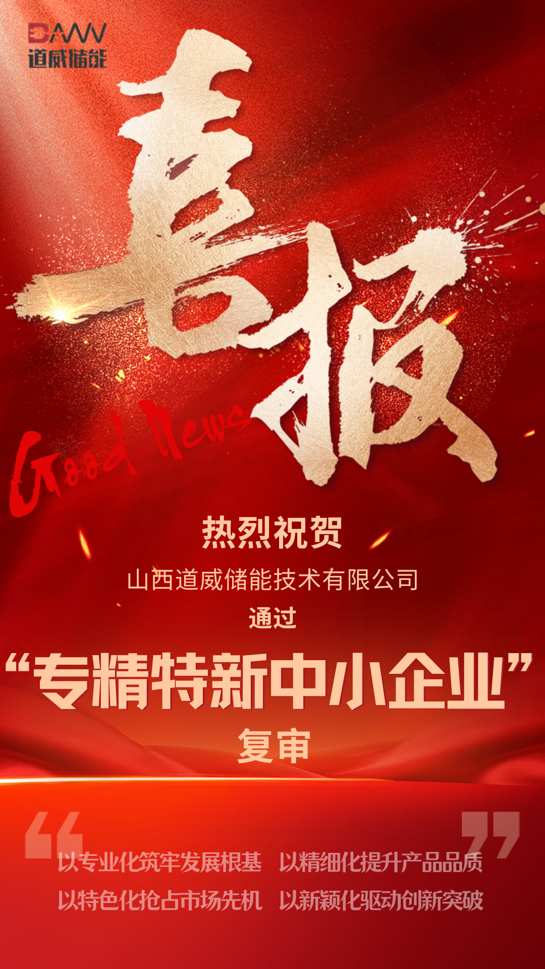 在山西省工業(yè)和信息化廳組織開展的 2025 年專精特新中小企業(yè)復審工作中,北京道威儲能集團有限公司旗下全資子公司 —— 山西道威儲能技術(shù)有限公司,憑借扎實過硬的專業(yè)實力、亮眼突出的創(chuàng)新成果與穩(wěn)健向好的發(fā)展態(tài)勢,歷經(jīng)材料嚴苛審核、實地細致核查、專家綜合評審等多輪嚴格篩選,成功通過此次復審,繼續(xù)保有 “專精特新中小企業(yè)” 榮譽稱號!這既是對道威儲能發(fā)展成果的權(quán)威認可,更是我省培育優(yōu)質(zhì)中小企業(yè)的生動實踐。