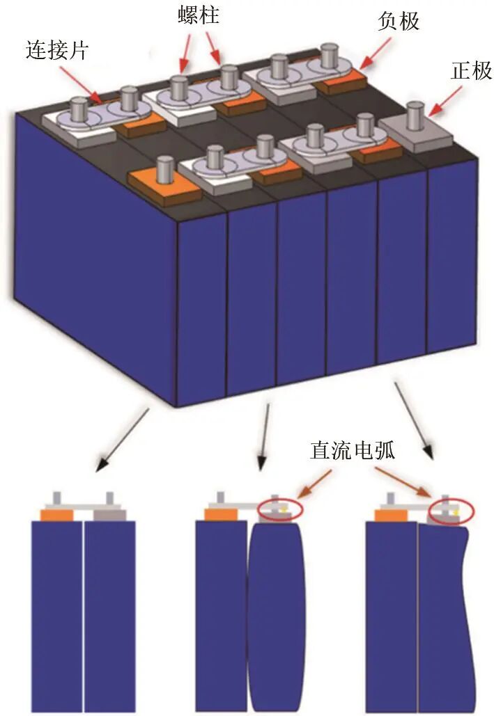在儲能系統(tǒng)和電動車輛中,為滿足系統(tǒng)的功率輸出要求,電池系統(tǒng)將多個電池單元和模組進(jìn)行串并聯(lián)。因此,系統(tǒng)內(nèi)部串并聯(lián)結(jié)構(gòu)的穩(wěn)定性對系統(tǒng)安全性至關(guān)重要。在電池系統(tǒng)的循環(huán)過程中,由于電池老化、膨脹或機(jī)械應(yīng)力等因素,連接電池的焊點(diǎn)可能會松動或斷裂。這將導(dǎo)致電池之間的連接點(diǎn)處形成電弧,如圖8所示。因此,電弧放電加上高溫影響可能會導(dǎo)致電池端子和連接器出現(xiàn)嚴(yán)重的電化學(xué)腐蝕問題。這不僅顯著縮短電池壽命,更嚴(yán)重威脅系統(tǒng)運(yùn)行安全,甚至可能觸發(fā)熱失控連鎖反應(yīng)導(dǎo)致火災(zāi)。