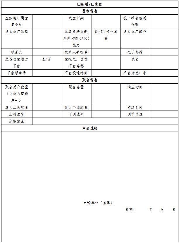 虛擬電廠接入業(yè)務(wù)申請(qǐng)單