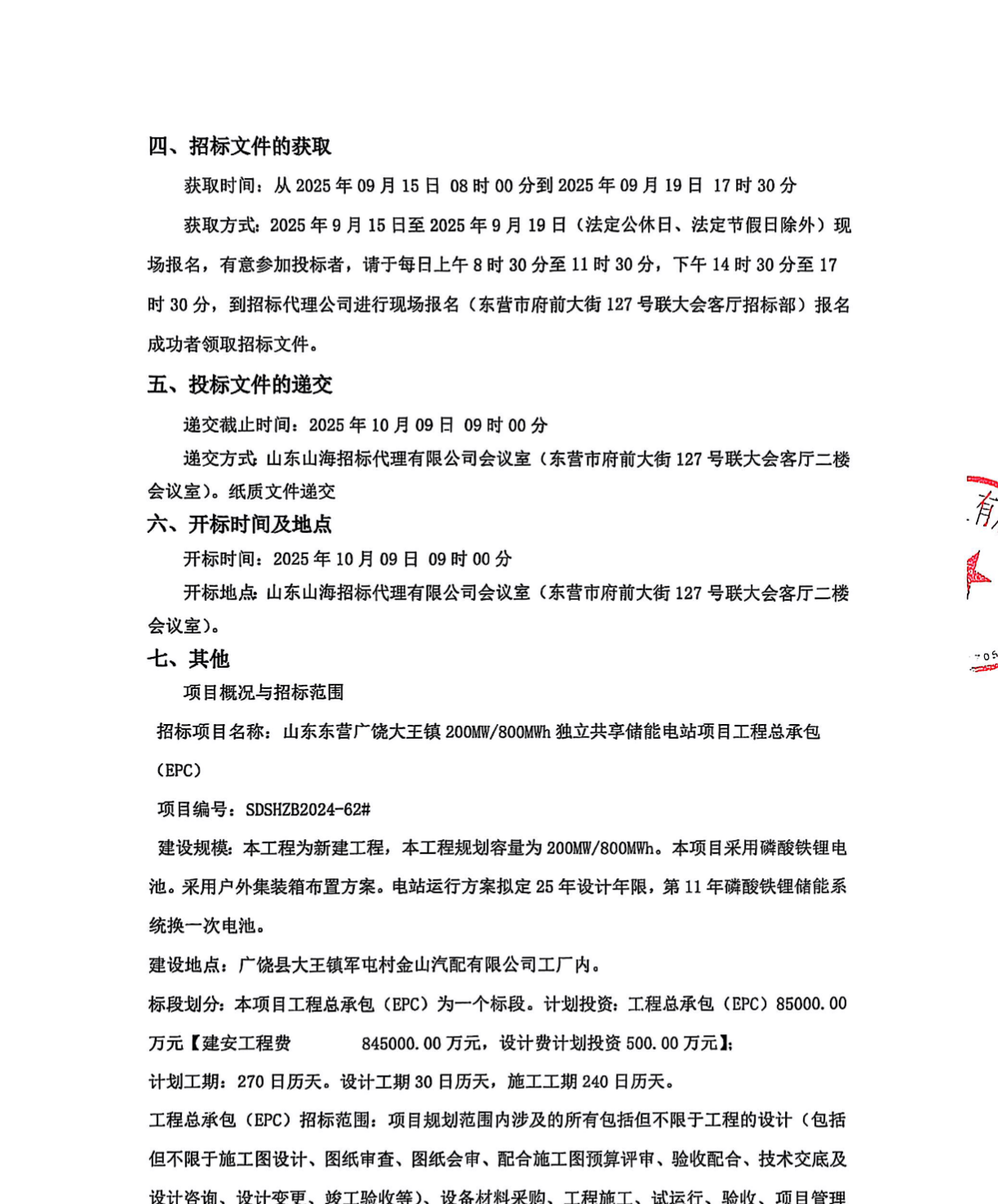 中國儲能網(wǎng)訊:9月12日,山東東營廣饒大王鎮(zhèn)200MW/800MWh獨立共享儲能電站項目工程總承包(EPC)招標(biāo)。