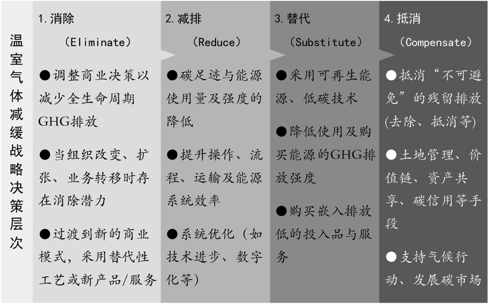 在制定零碳路線圖(Decarbonization Roadmap)方面,國際環(huán)境管理與評價協(xié)會(IEMA)提出的排放減緩/減少的層次分析結(jié)構(gòu),可指導(dǎo)產(chǎn)業(yè)、園區(qū)以及利益相關(guān)者制定脫碳戰(zhàn)略。這為決策者提供了一種結(jié)構(gòu)化的分析與評估方法,可綜合考慮脫碳目的、預(yù)算、風(fēng)險與場地限制等因素。