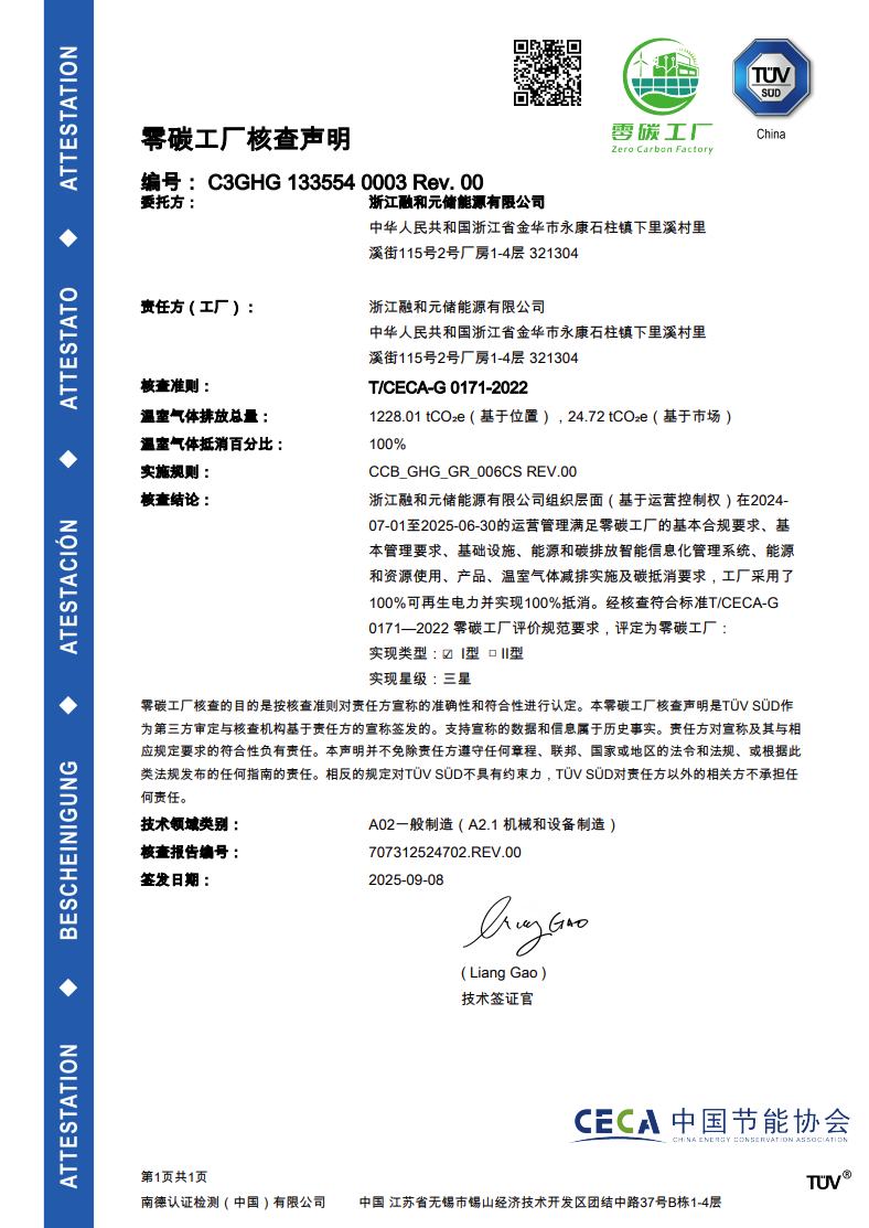 中國儲能網(wǎng)訊:在中國“雙碳”目標擘畫出綠色發(fā)展新藍圖的時代背景下,融和元儲以“萬物共儲,和合共生”為使命,將可持續(xù)發(fā)展融入核心戰(zhàn)略。在該理念的指引下,近日,融和元儲永康智造基地成功通過國際權威認證機構TüV南德意志集團(以下簡稱“TüV南德”)檢測,獲得“零碳工廠”認證,成為融和元儲踐行綠色發(fā)展、邁向凈零排放目標的典范。