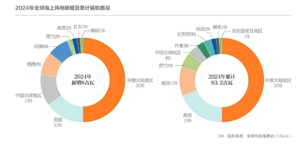 同時(shí),全球海上風(fēng)電市場也迎來高速增長。全球風(fēng)能理事會(huì)預(yù)測,到2030年,全球新增海上風(fēng)電裝機(jī)容量將達(dá)31.9吉瓦,較2019年增長423%;2020至2025年間復(fù)合增長率將高達(dá)18.6%。中國在其中扮演關(guān)鍵角色。2024年全球新增海上風(fēng)電裝機(jī)中,中國的新增裝機(jī)容量占比超過50%,累計(jì)裝機(jī)容量也占據(jù)全球半壁江山。