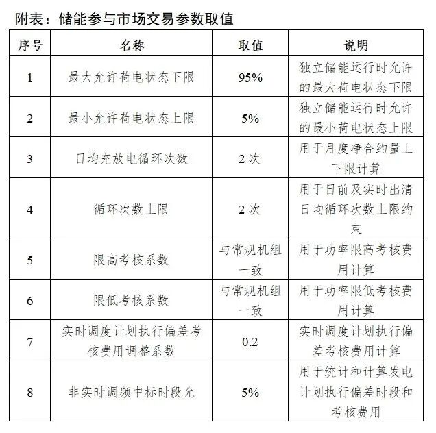 獨立儲能以充電和放電兩個獨立交易單元參與中長期電能量交易,充電交易單元參照用電側(cè)購電單元管理(不可被售電公司代理),放電交易單元參照發(fā)電側(cè)售電單元管理。儲能參與市場交易參數(shù)取值詳見附表。