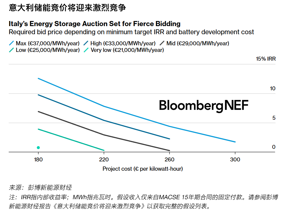 意大利首個大型獨立儲能支持計劃——Meccanismo di approvvigionamento di capacitá di stoccaggio (MACSE)——將于9月30日進(jìn)行首輪競價,競價裝機(jī)容量為10GWh。彭博新能源財經(jīng)預(yù)計,電池開發(fā)商之間將為爭奪15年期合同展開激烈競爭,這一合同可以保護(hù)項目免受商業(yè)電價風(fēng)險的影響。這可能會導(dǎo)致投標(biāo)價格下降,最低可能比競價設(shè)定的上限低43%。