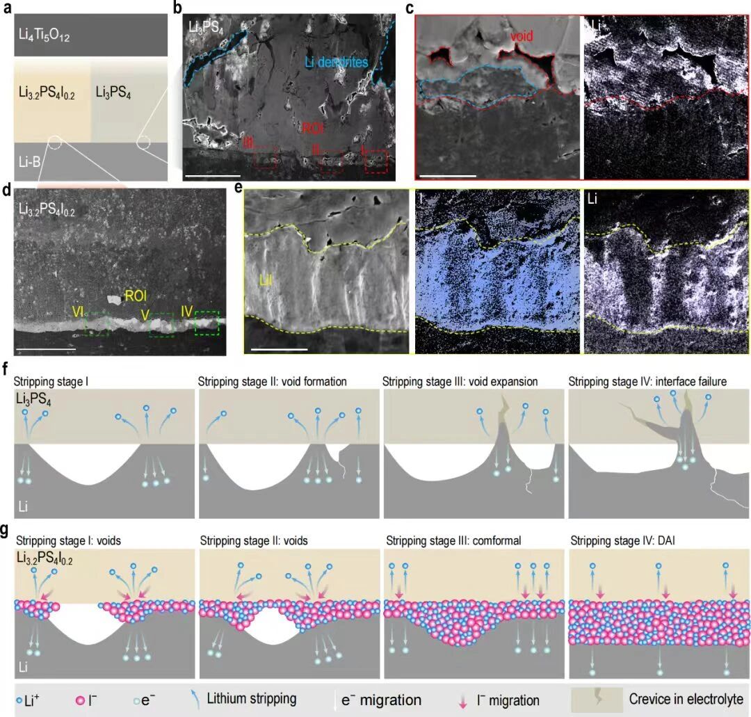 動態(tài)自適應(yīng)界面穩(wěn)定全固態(tài)鋰電池的機(jī)理研究。(a-e)處于剝離狀態(tài)下,Li–B|Li3PS4界面 (b, c) 和 Li–B|Li3.2PS4I0.2界面 (d, e) 的截面SEM圖像和AES元素面分布圖。比例尺為50 μm (b, d) 和10 μm (c, e)。(f)傳統(tǒng)無動態(tài)自適應(yīng)界面電池界面失效過程示意圖。(g)動態(tài)自適應(yīng)界面改善全固態(tài)鋰電池循環(huán)性能的工作機(jī)理示意圖。