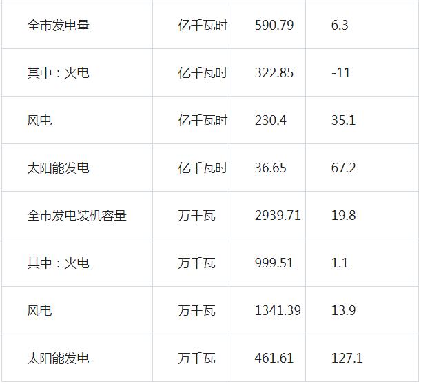 1-9月份,全市發(fā)電量590.79億千瓦時,同比增長6.3%。其中,火電322.85億千瓦時,同比下降11%;風(fēng)電230.4億千瓦時,同比增長35.1%;太陽能36.65億千瓦時,同比增長67.2%,儲能0.02億千瓦時,與去年同期持平;生物質(zhì)發(fā)電0.87億千瓦時,同比增長26.1%。