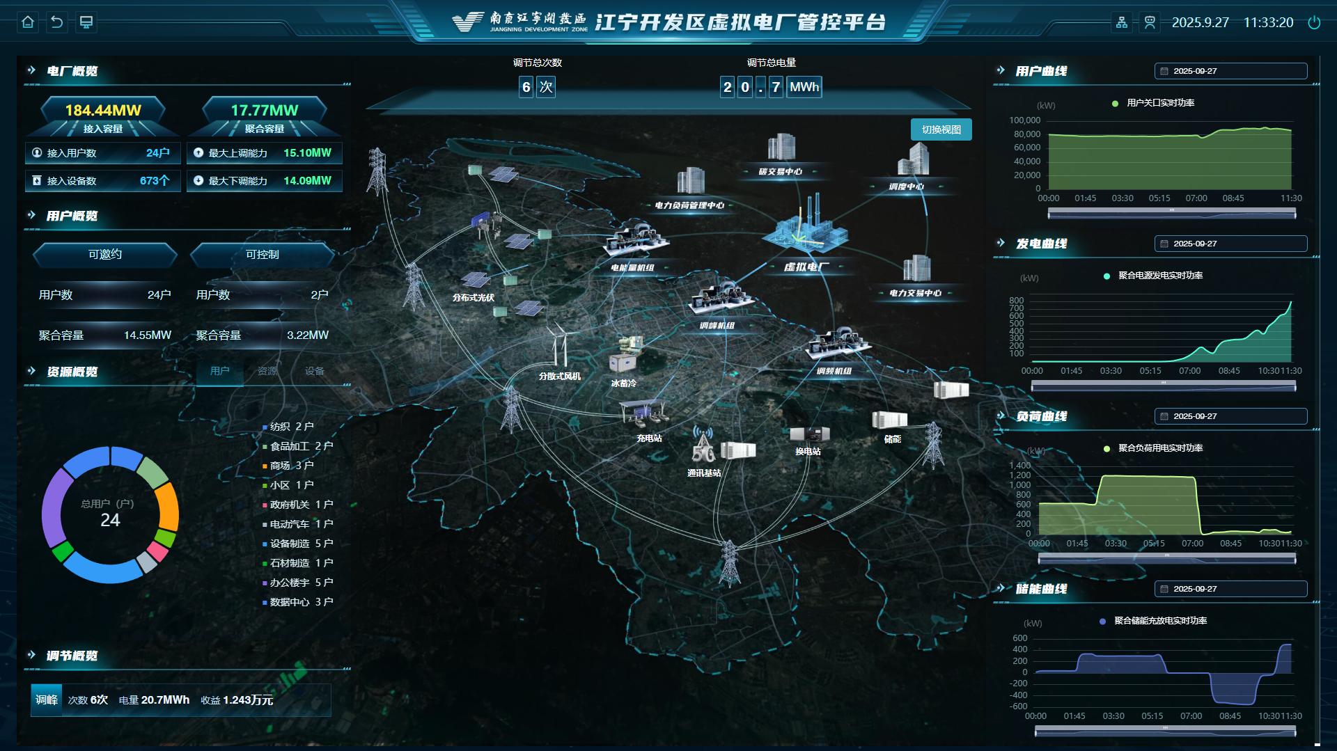 該公司的成立,標志著三方合作的項目“江寧開發(fā)區(qū)能碳虛擬電廠示范項目”正式邁入實體化市場運營新階段。項目綜合運用發(fā)電預(yù)測、負荷預(yù)測、價格預(yù)測、可調(diào)潛力分析、資源聚合、優(yōu)化調(diào)度、協(xié)調(diào)控制及交易輔助決策等核心技術(shù),聚合區(qū)內(nèi)分布式光伏、儲能、充電樁、空調(diào)負荷、冰蓄冷、電鍋爐、工業(yè)可調(diào)負荷等多元化靈活性資源,常態(tài)化參與需求響應(yīng)、電力輔助服務(wù)及電力現(xiàn)貨等市場化交易,為用戶提供智能化、集約化的智慧用能服務(wù)。項目創(chuàng)新性提出“電碳耦合”與“配微協(xié)同”技術(shù),構(gòu)建區(qū)域多層協(xié)同的智慧能碳管控平臺,服務(wù)政府、園區(qū)及企業(yè)建立覆蓋全生命周期、全環(huán)節(jié)、全鏈條的智慧能碳管理系統(tǒng),實現(xiàn)碳足跡精準追溯,降低用能成本,有效提升能源綜合利用效率,推動區(qū)域碳排放強度持續(xù)降低。項目已接入各類用戶側(cè)資源規(guī)模達200兆瓦,并于2025年4月成功入選國家發(fā)展改革委全國第二批綠色低碳先進技術(shù)示范項目清單,成為國家級綠色低碳示范標桿。