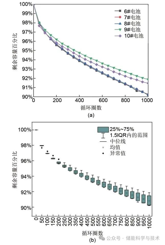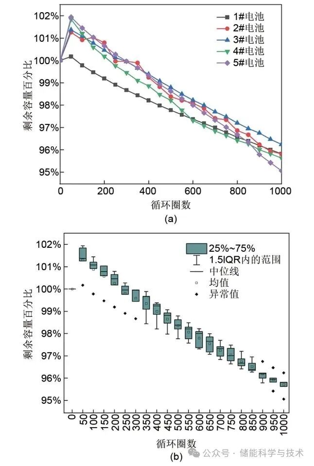 圖2 常溫25 ℃循環(huán)性能:(a) 點線圖;(b) 箱線圖
